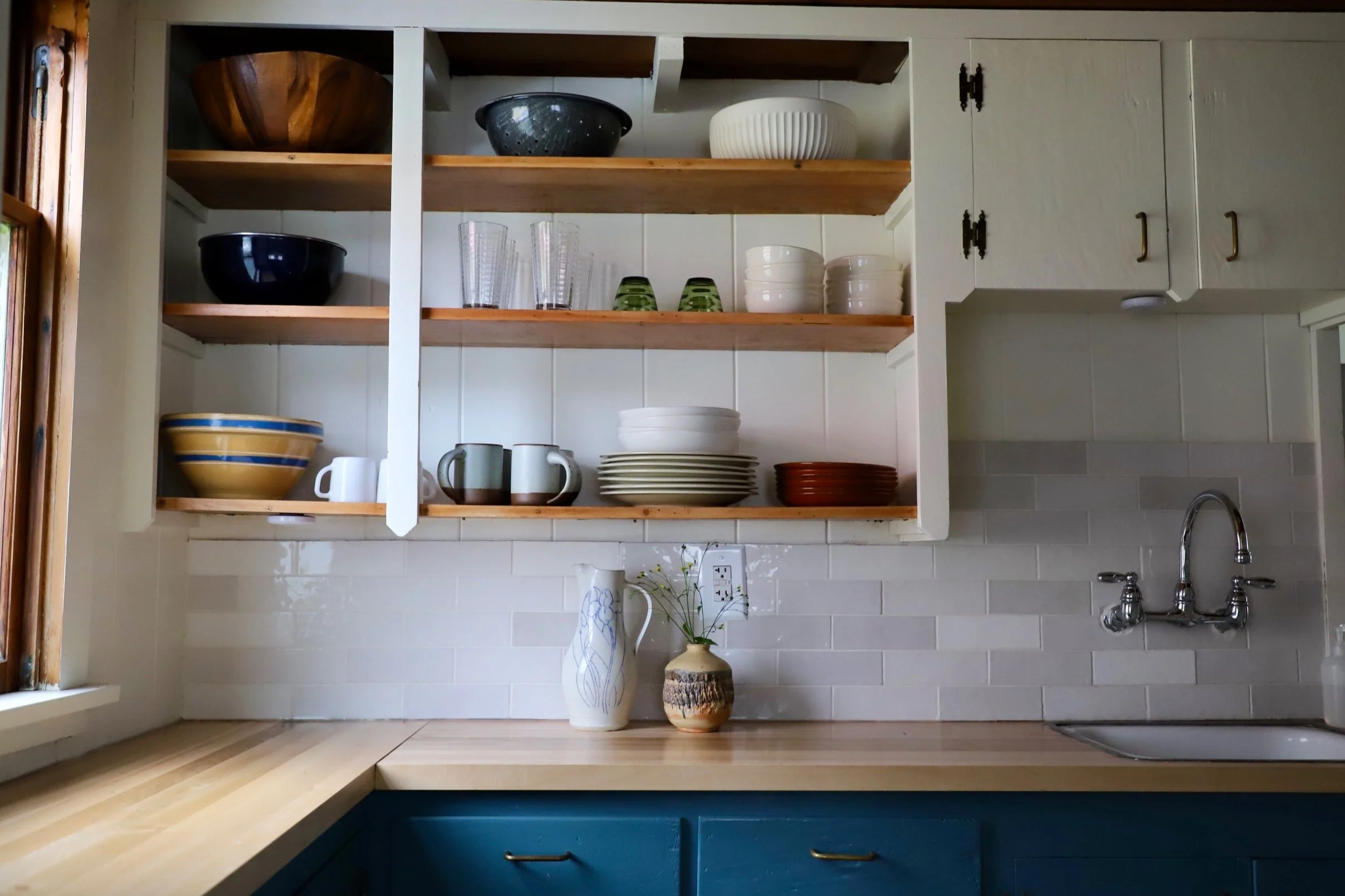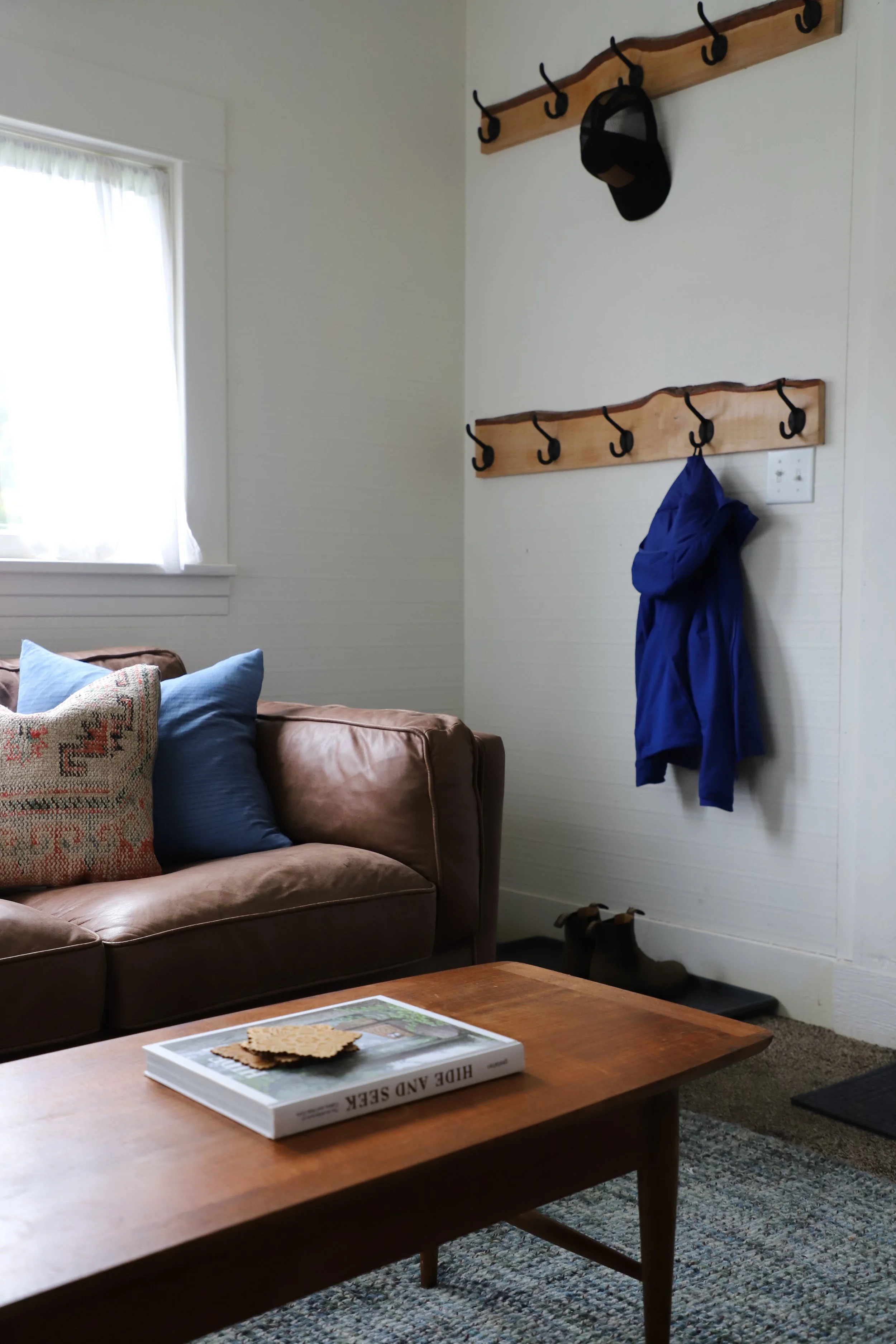 The little cabin that started it all! This 2 bed, 1 bath tiny cabin had a stellar fireplace that was accentuated with the choice of paint colors. The original kitchen cabinets were transformed by a fresh coat of pain to the bottoms and removing the doors from the upper cabinets to create open shelving. Well placed vintage pieces and textiles create a sense of warmth and depth to the space.